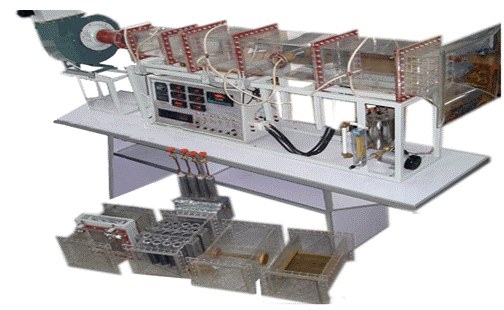 風機,自動調節風門,組合式有機玻璃風洞,有機玻璃實驗管段,有機玻璃叉排、順排實驗段,旋轉圓柱試件,紫銅平板試件,穩壓電源配電位器調節加熱功率,電流表,電壓表,畢托管及差壓傳感器,PT100熱電阻測溫,巡檢儀顯示溫度、阻力、流量,不銹鋼臺架等。