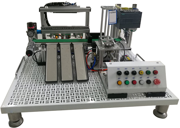 (4)按鈕模塊采用型材底座,安裝面板與桌面成45°夾角,包含急停按鈕1只,旋鈕開關(guān)3只,自鎖帶燈按鈕黃、綠、紅各1只,所有按鈕和旋鈕觸點均引至端子接線排上;自動上料模塊主體安裝在工業(yè)型材上,結(jié)構(gòu)由鋁型材構(gòu)成,方型工件庫1件,物料推出機構(gòu)1件,光電傳感器,單缸氣缸1只,主要完成將工件庫中的工件依次推出;傳輸線模塊主要包含直流電機1臺,滾動軸承4只,滾輪2只,傳輸帶1條,主要完成將工件輸送到分揀區(qū);物料檢測及分揀模塊主要包含氣缸3個,電感傳感器1只,電容傳感器1只;漫反射式光電傳感器1只,物料分揀槽3個,完成物料的分揀工作。調(diào)壓閥主要安裝在型材底座支架上,含有手滑閥可控制氣路的通斷和壓力。輔助器件包含接線端子、物料、實訓(xùn)導(dǎo)線、氣管等,模型控制所需的I/O點數(shù)與所配主機I/O點數(shù)相配套。氣缸使用范圍0.1-1MPa,工作溫度-15-60℃,活塞帶磁環(huán)可完成檢測;光電傳感器檢測范圍不小于1CM,輸出電流80-200MA,防護(hù)等級IP65,輸出方式NPN常開;傳感器檢測范圍不小于1CM,輸出電流80-200MA,防護(hù)等級IP65,輸出方式NPN常開。