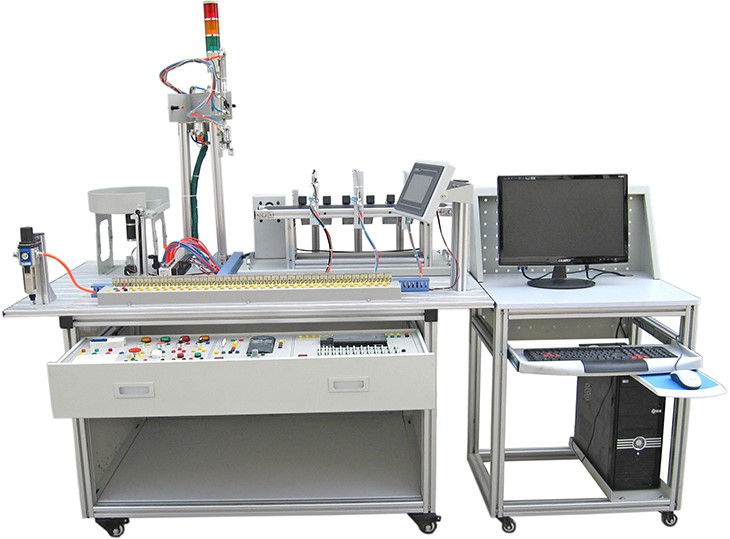 光機電一體化控制實訓裝置由由鋁合金導軌式實訓臺、典型的機電一體化設備的機械部件、PLC模塊、變頻器模塊、按鈕模塊、電源模塊、模擬生產設備實訓模塊、接線端子排和各種傳感器、計算機等組成。整體結構采用開放式和拆裝式,實訓裝置用于機械部件組裝,可根據現有的機械部件組裝生產設備,也可添加機械部件組裝其他生產設備,使整個裝置能夠靈活的按教學或競賽要求組裝具有生產功能的機電一體化設備。模塊采用標準結構和抽屜式模塊放置架,互換性強;按具有生產性功能和整合學習功能的原則確定模塊內容,使教學或競賽時可方便的選擇需要的模塊。設備需完全符合電工電子全國職業技能大賽所要求,同時還要求具有可拓展功能,可以組成更加大型的生產模擬系統,以配合各個用戶學校不同層次,不同專業的教學及培訓要求。