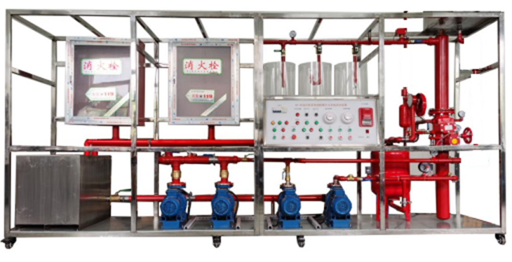 “自動噴淋及消防栓滅火系統裝置”依據《自動噴水滅火系統設計規范》相關標準設計,該系統具有噴水滅火系統典型結構,能夠完成火災探測,火災報警,現場滅火等演示性實訓項目,同時還能清楚的展示噴淋滅火系統的典型設備構成和系統工作原理,通過該裝置的操作學習,學生可以對樓宇中噴水滅火系統的結構有一個全面的了解,掌握建筑物內部主要滅火設備的應用,熟悉樓宇中濕式報警閥、水流指示器、壓力開關等滅火設備的結構和原理,熟悉滅火系統的控制原理和工作過程。它適用于學習《建筑滅火系統》、《樓宇給排水系統》、《樓宇消防控制系統》等專業課的中職業院校的實訓教學。